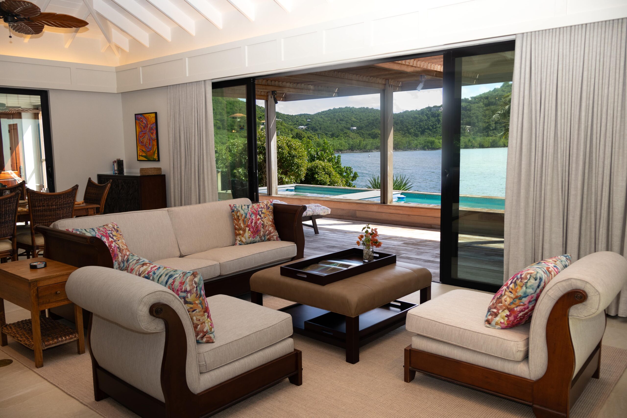 Dining options include a screened outdoor area for six with breathtaking views, a grill, and casual counter space, as well as an indoor dining area for six. The tropical garden features stone paths that lead through vibrant palms, banana trees, and flowering plants, creating a serene ambiance. Additional conveniences include a washer and dryer, linens, beach chairs, coolers, beach bags, and even a paddleboard for seaside adventures. Whether you’re lounging by the pool, exploring the garden, or dining with a view, Monarch Cottage offers a seamless blend of comfort and Caribbean charm.